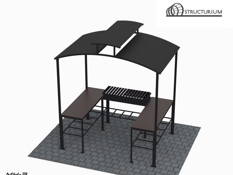 При производстве Мангала с навесом и столиками используется профильная труба 40*40*2мм, 40*25*2мм и 20*20*2мм, а также лист 3мм. Покрытие крыши лист 2мм. Материал столешниц столиков – влагостойкая ламинированная фанера 9мм на металлокаркасе. Покраска термостойкой краской, цвет черный.
